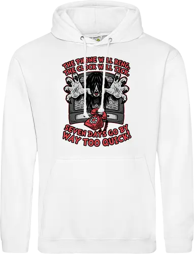 This cute, funny, and awesome t-shirt is perfect for those who love classic vintage retro children's poem books, classic Japanese horror movies, the spooky season, and scary creatures. Featuring a creepy ghost girl coming out of an old television, with the quote "The phone will ring, the clock will tick, seven days go by way too quick!".