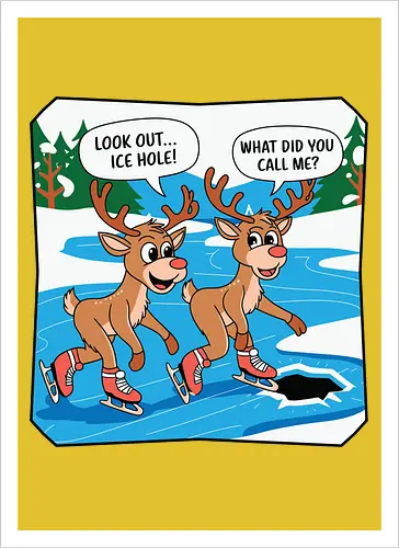 Two cartoon reindeer are ice skating on a frozen pond, with one warning the other about a hole in the ice. The reindeer exchange humorous dialogue, adding a playful tone to the scene.
