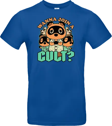 This cute, funny, and awesome t-shirt is perfect for those who love video games, cults, dark humor, farming, adventure, and gaming. It features a tanuki/ raccoon landlord manager from an island with two kids, with the quote "wanna join a cult?".