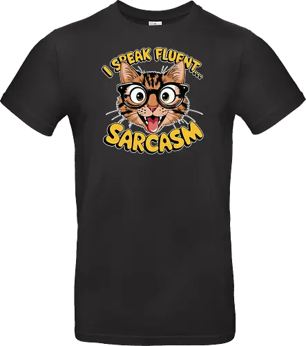 A cheerful cat wearing glasses is depicted with the phrase "I Speak Fluent... Sarcasm". The expression and text suggest a humorous and witty tone.
