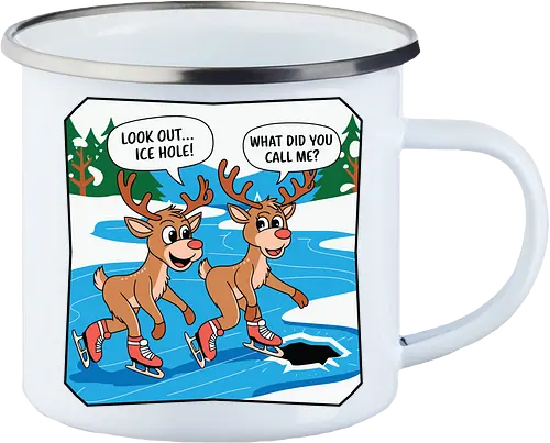 Two cartoon reindeer are ice skating on a frozen pond, with one warning the other about a hole in the ice. The reindeer exchange humorous dialogue, adding a playful tone to the scene.