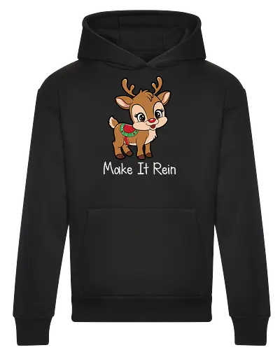 A cute cartoon reindeer with large eyes and antlers stands above the phrase "Make It Rein" . The reindeer wears a festive green and red saddle.
