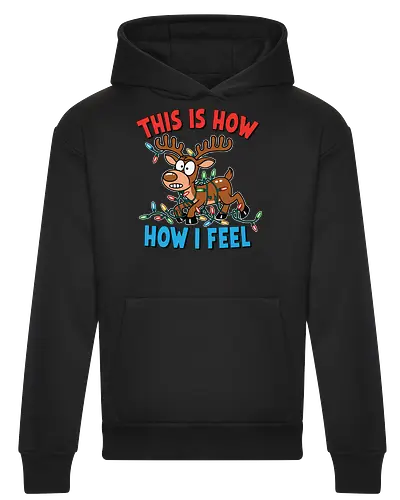 A cartoon reindeer looks frazzled as it is tangled in a string of colorful Christmas lights. Above and below the reindeer, the text reads "THIS IS HOW" and "HOW I FEEL" in red and blue lettering.